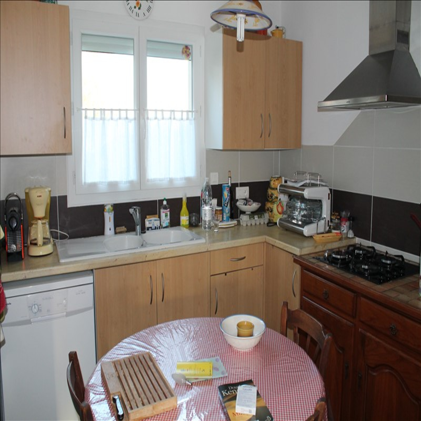 Castets en Dorthe, 10min de LANGON, maison T4 de plain pied avec salon séjour, coin cuisine avec hotte et placards, salle d'eau, wc séparé, 3 chambres dont 2 avec placards, terrasse, jardin clos d'environ 400m², garage.