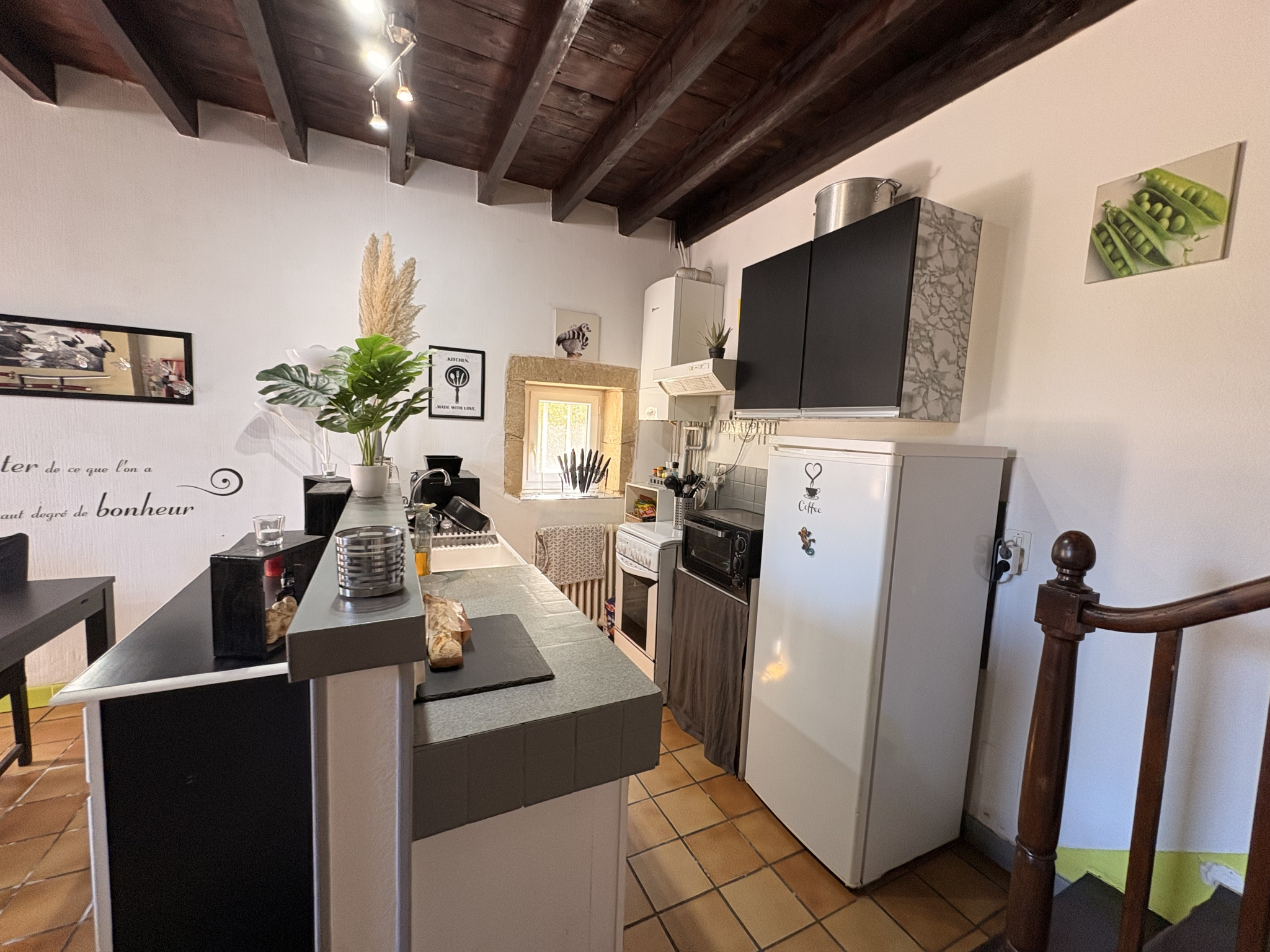 Sur l'axe Bazas-Langon, à Mazères, maison T2 en rdc + 1, composée au rdc de la pièce de vie avec coin cuisine, wc, à l'étage, une salle de bain et une grande chambre. Jardin clos, grand garage. Cuve de gaz, poêle à bois dans le séjour.