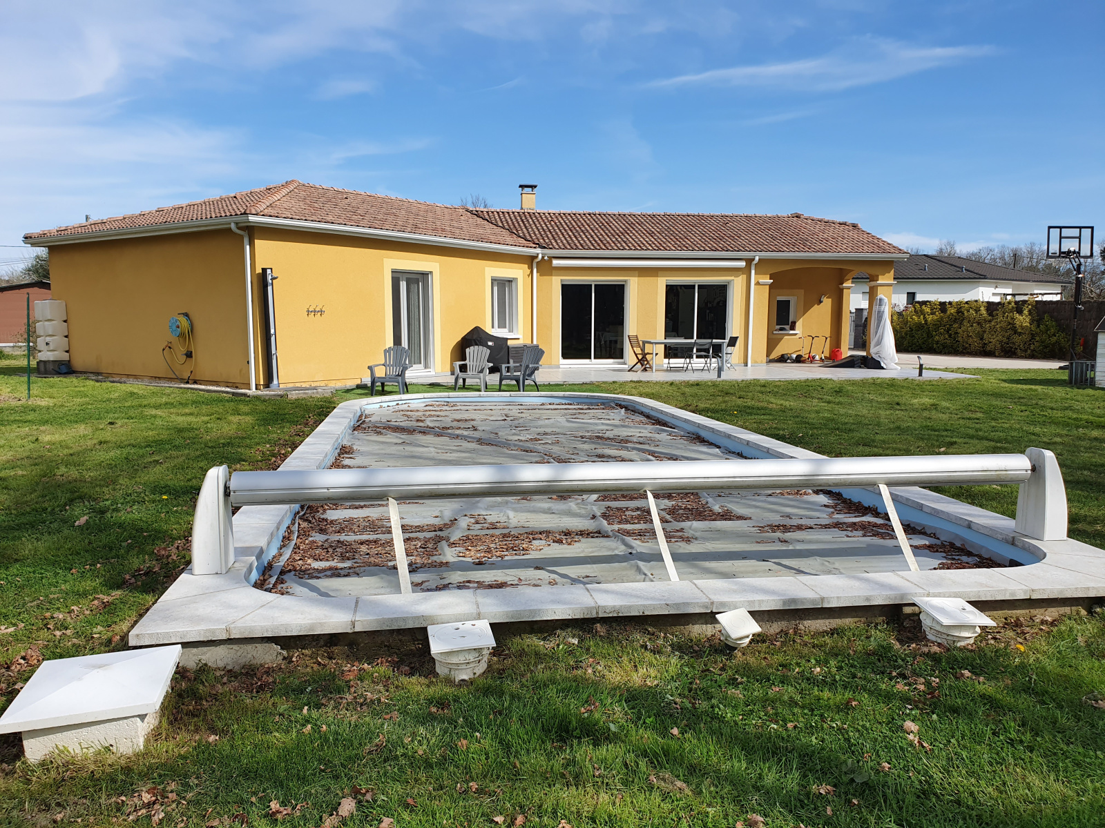 A l'extérieur, une terrasse couverte et une autre non couverte donnant sur la piscine. Local technique avec moteur et pompe à chaleur pour la piscine.