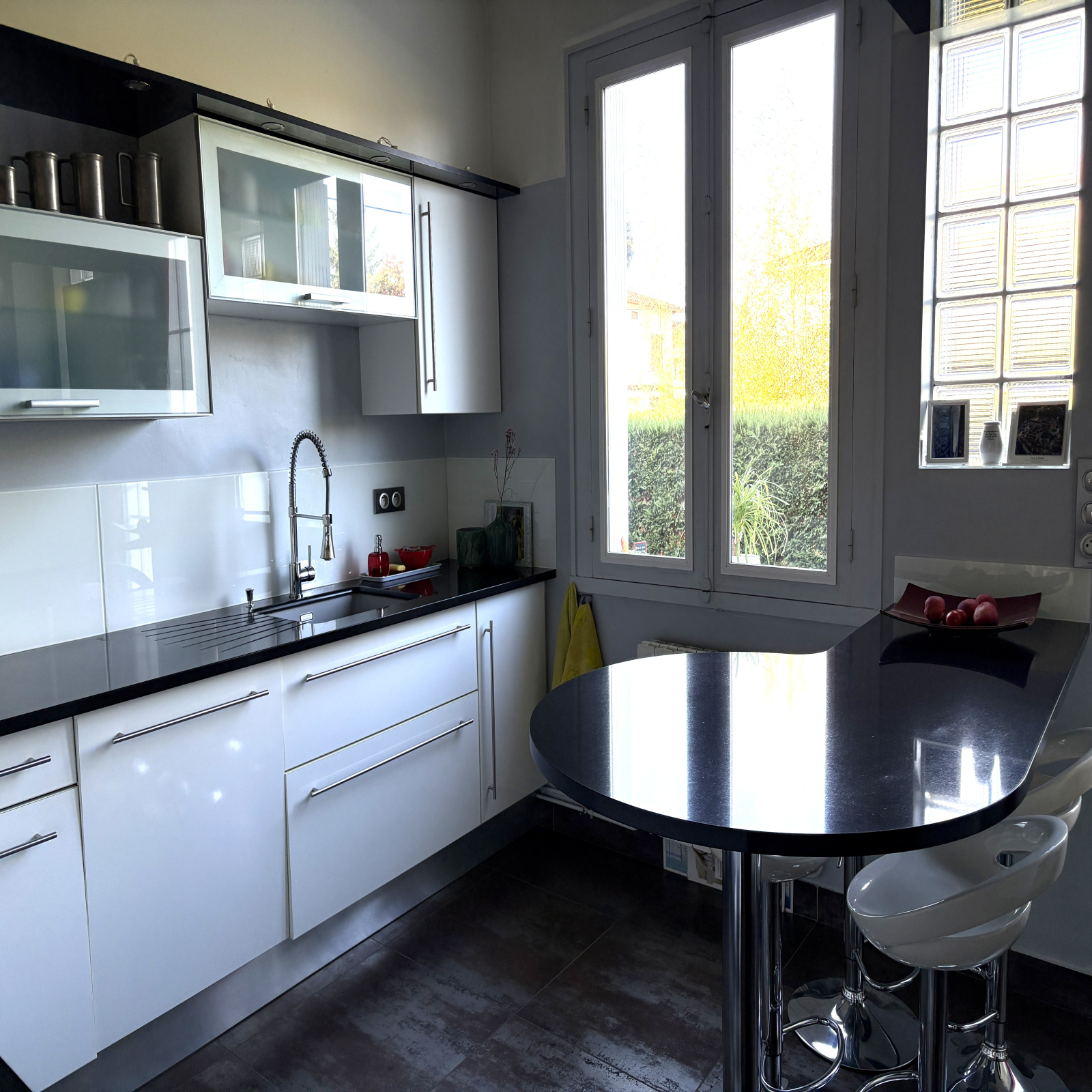 Jardin arboré clos, piscinable, maison trés bien entretenue, lumineuse, avec de beaux volumes.