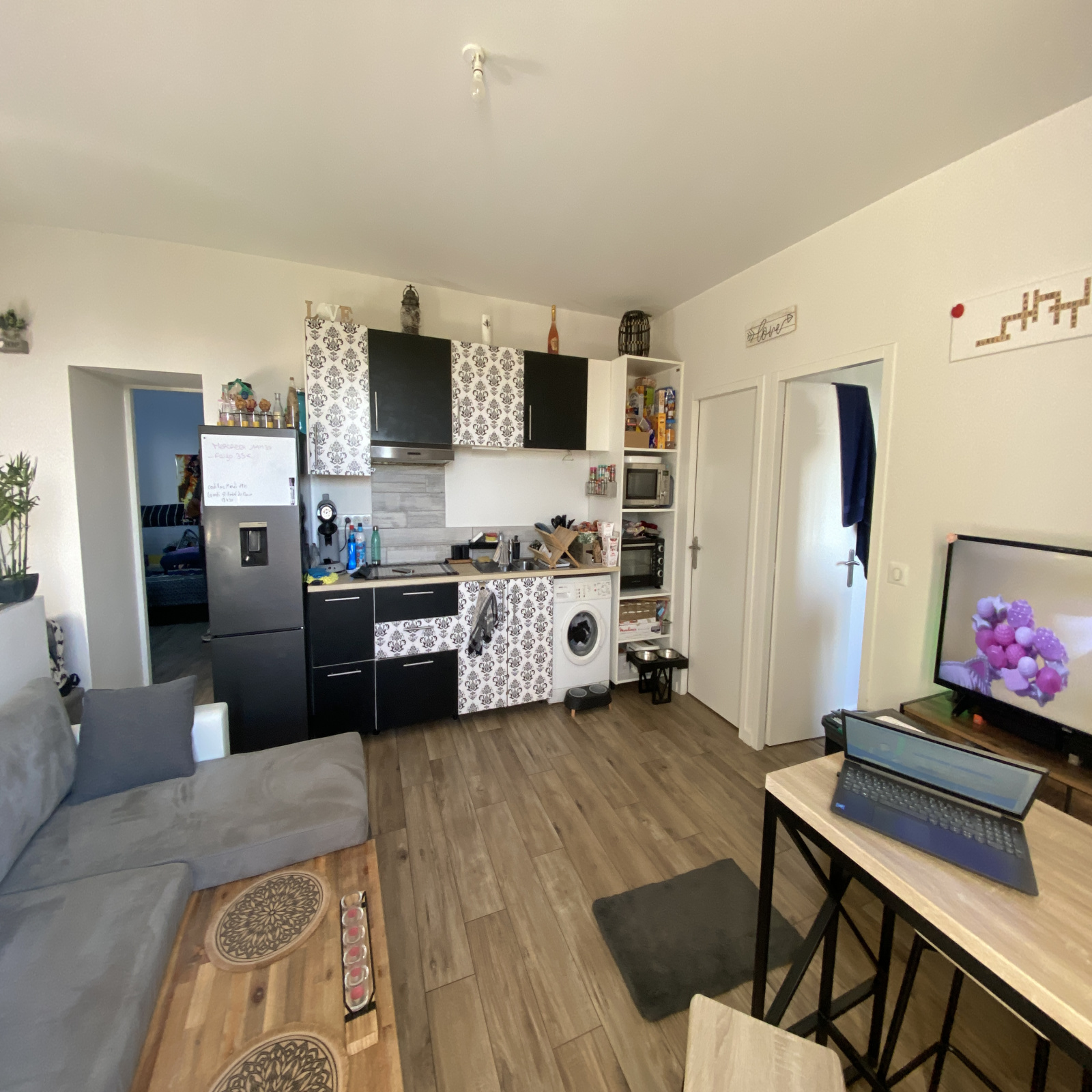 Logement composé d'une cuisine ouverte sur séjour, une chambre, un bureau, une salle d'eau avec wc et balcon.