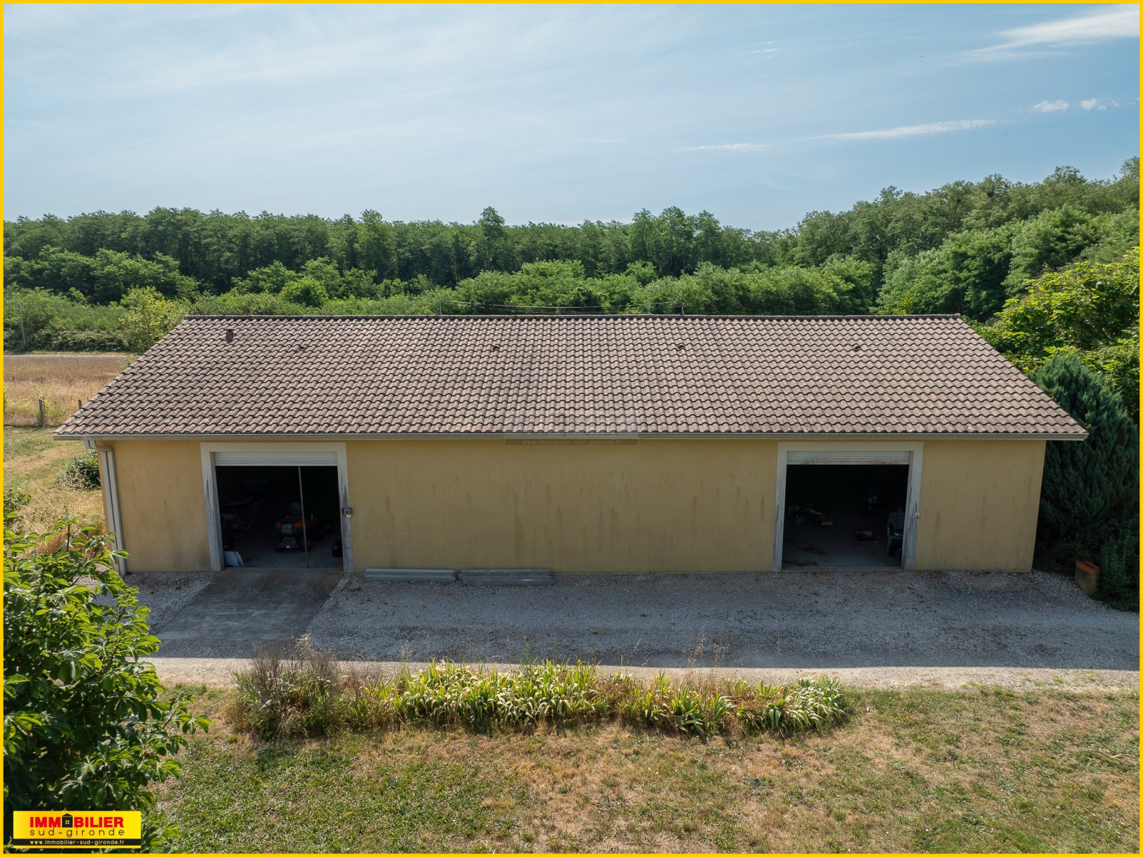 Double garage attenant isolé de plus de 50 m² avec deux portes sectionnelles motorisées.