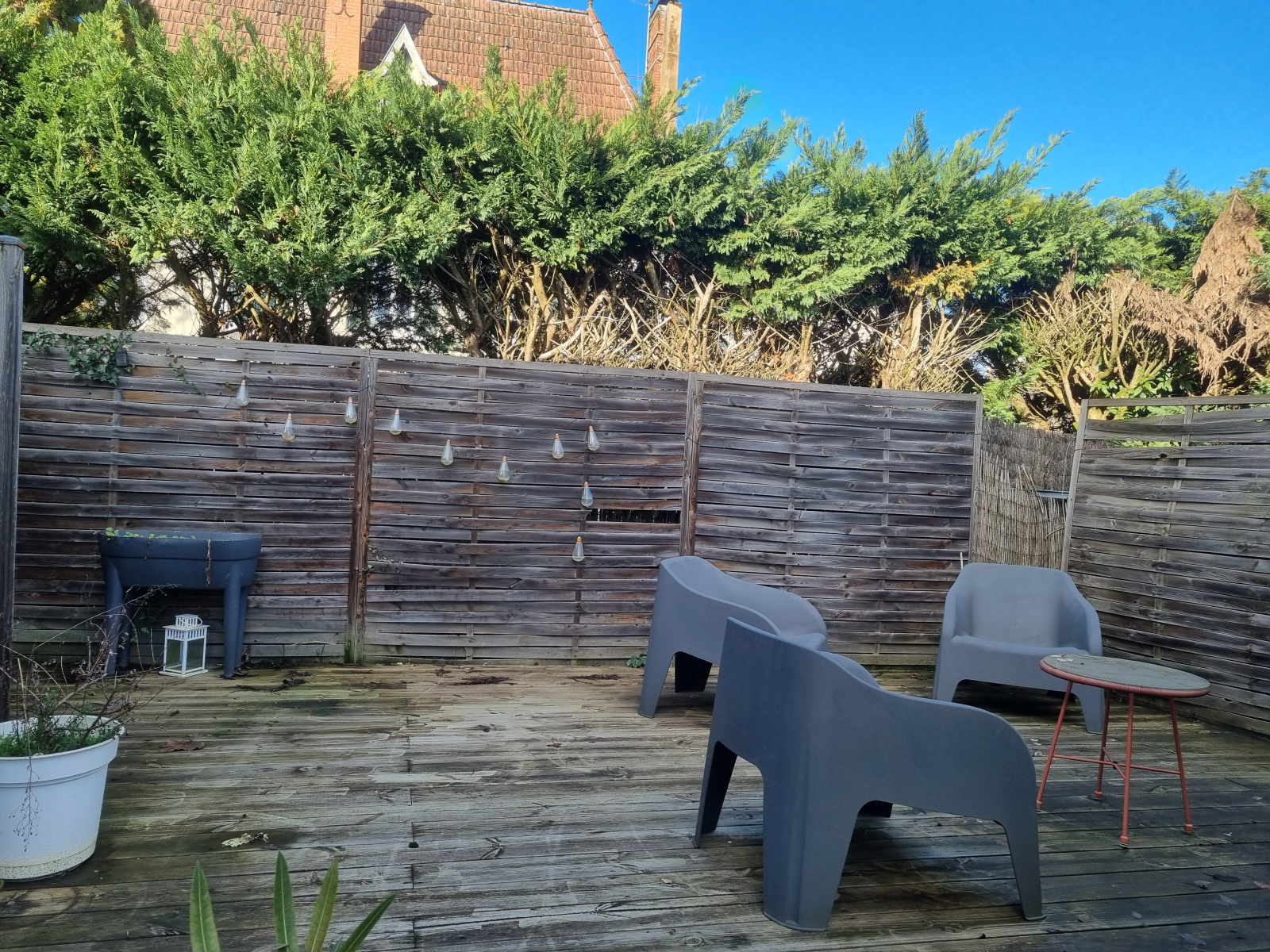 L'exterieur est agrémenté d'un garage, d'une terrasse en bois ambiance cosy et d'un espace vert.